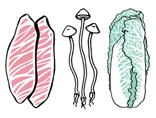 Here's some food from my instructional sukiyaki poster. I'm printing the first 2 colours of the 4-colour screen party I've thrown for myself tomorrow, so go bribe whatever god you've got at hand with some bling, and tell them I sent you. I need some cosmic goodwill to get through this. It can be done!